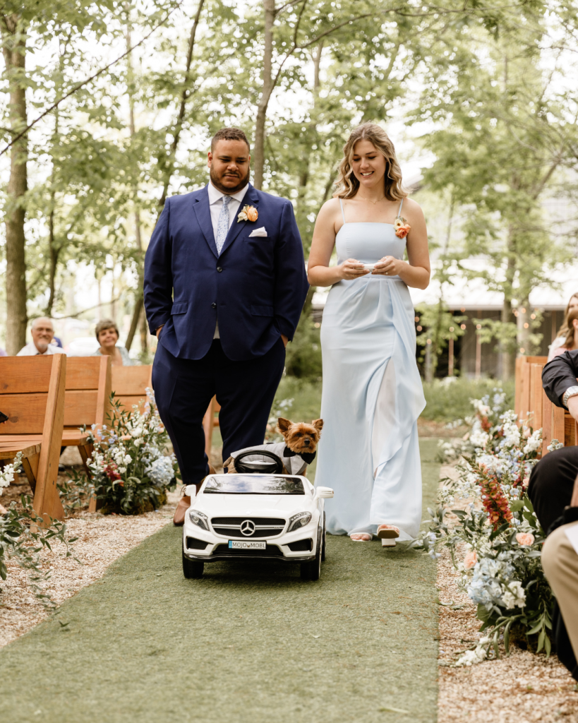 The ceremony took place outdoors in the forest beneath a majestic oak tree, creating a serene and meaningful backdrop as Emma and Sasha exchanged vows. Guests smiled as Mojo made his entrance, riding shotgun in a mini remote control Mercedes down the aisle.