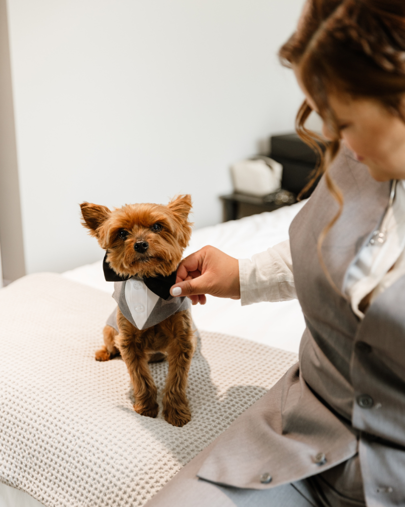 As hair and makeup wrapped up and final touches were added, the couple was joined by their Yorkie, Mojo, who stole the spotlight dressed in an adorable bow tie. The calm energy of the morning set the tone for a day rooted in love, personality, and connection.