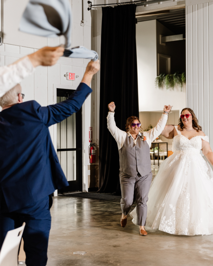 Following the ceremony, cocktail hour began as guests transitioned into Retreat 21’s open indoor reception space. The wedding party made a playful entrance wearing red heart shaped glasses, setting the tone for an evening filled with joy and celebration.