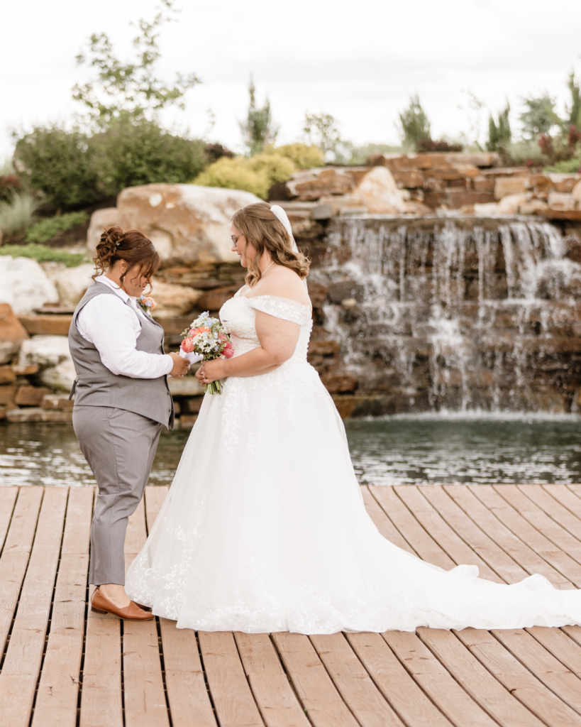 Emma and Sasha shared their first look just outside the venue’s flowing waterfall, one of the many picturesque features that makes Retreat 21 a sought after modern wedding venue in the Columbus area. The moment was beautifully captured by Erica Kay Photography and felt intimate, emotional, and full of anticipation.