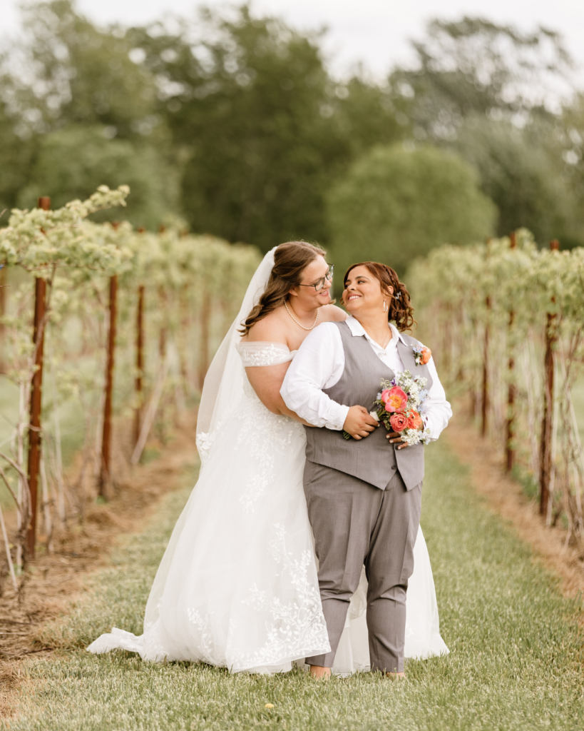 Mojo and Pepper joined the brides for portraits, adding an extra layer of sweetness to the experience. The couple continued their bridal portraits throughout the property, taking full advantage of the many photo locations Retreat 21 has to offer. From the vineyards to the natural landscape, each setting added a whimsical and romantic touch.