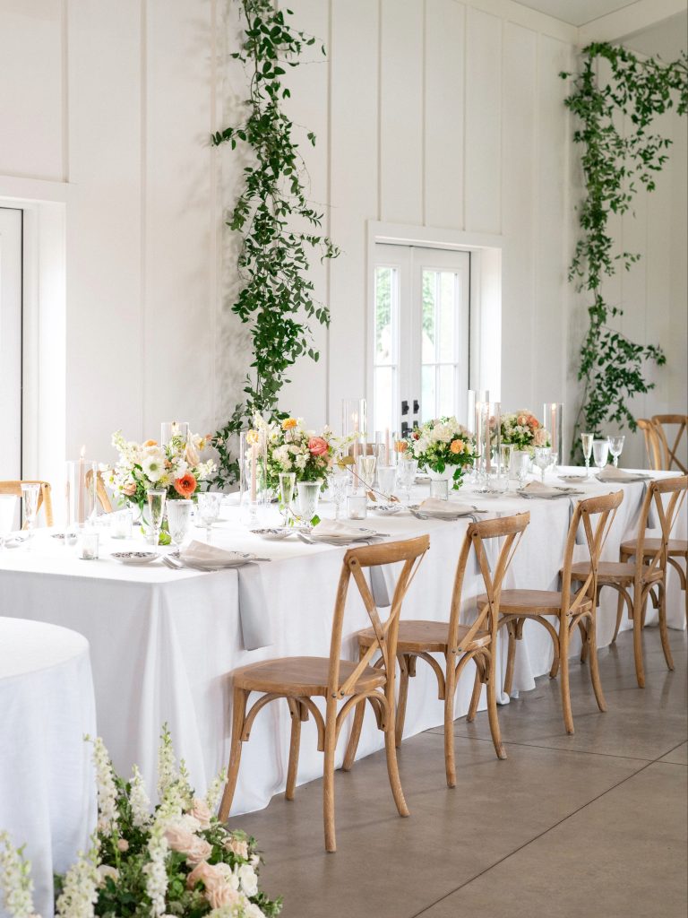 Floral artistry by Madison House Designs transformed the space into a blooming garden. Lush arrangements of blush and white softened the venue while framing the ceremony and reception in layers of natural elegance. From bouquets to statement installations, the florals carried the romantic theme throughout the day, bringing grace and texture to every setting.