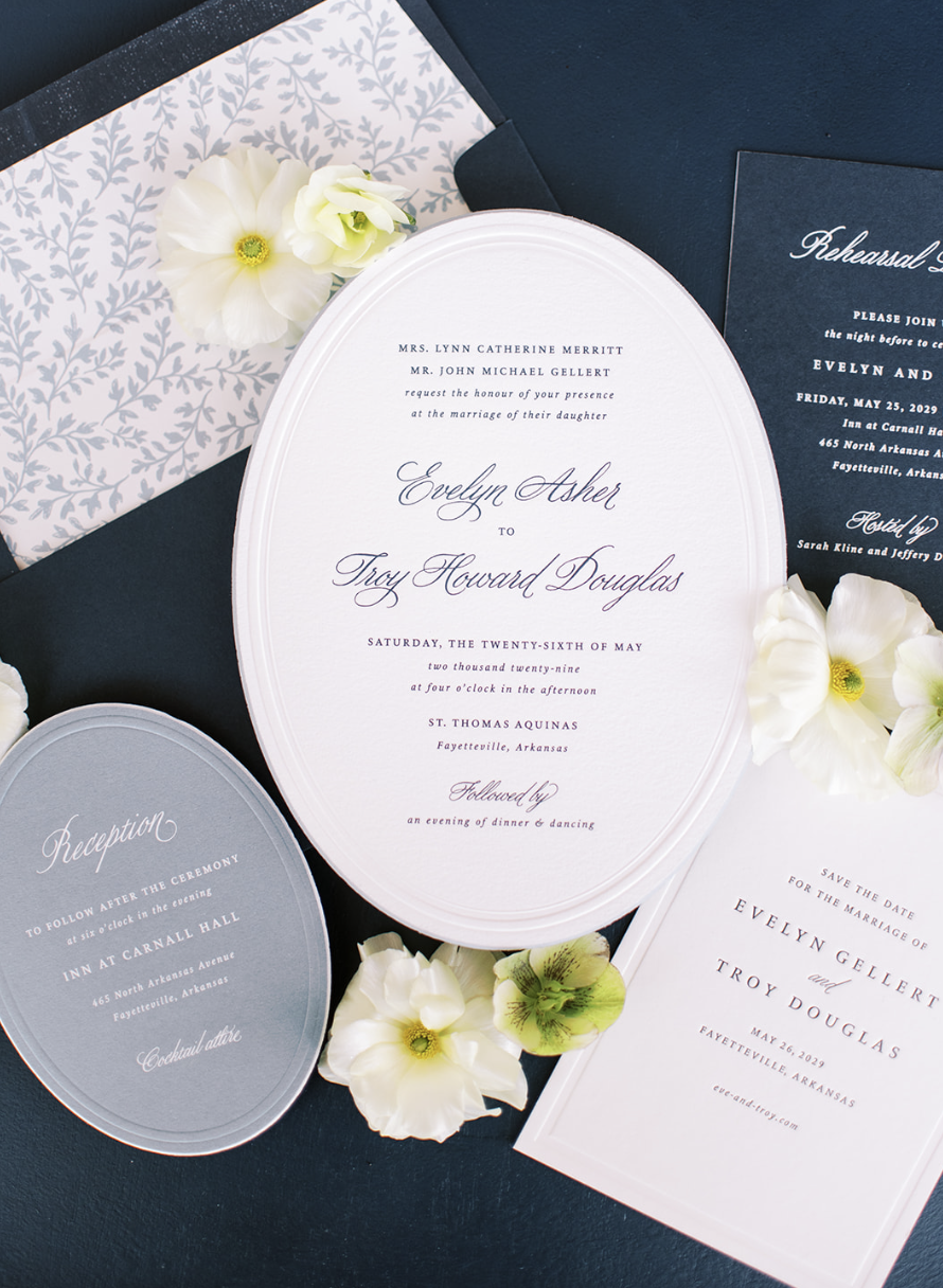 To allow couples to focus on design rather than budget, On Paper Press offers complimentary save the dates, card and envelope included, with every invitation order. Optional upgrades such as specialty shapes, premium paper, letterpress, or foil printing are available for clients who want to elevate their suite even further, but the foundation is always thoughtfully designed and beautifully executed.